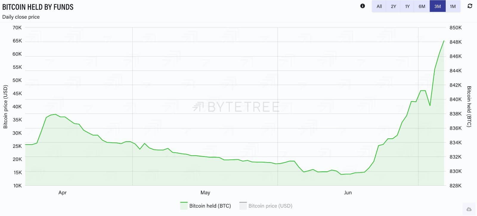 По данным финансовой исследовательской платформы ByteTree, по состоянию на 7 июля количество BTC, хранящихся в фондах, значительно увеличилось после того, как 15 июня BlackRock подала свою первую заявку на биткоин-ETF.