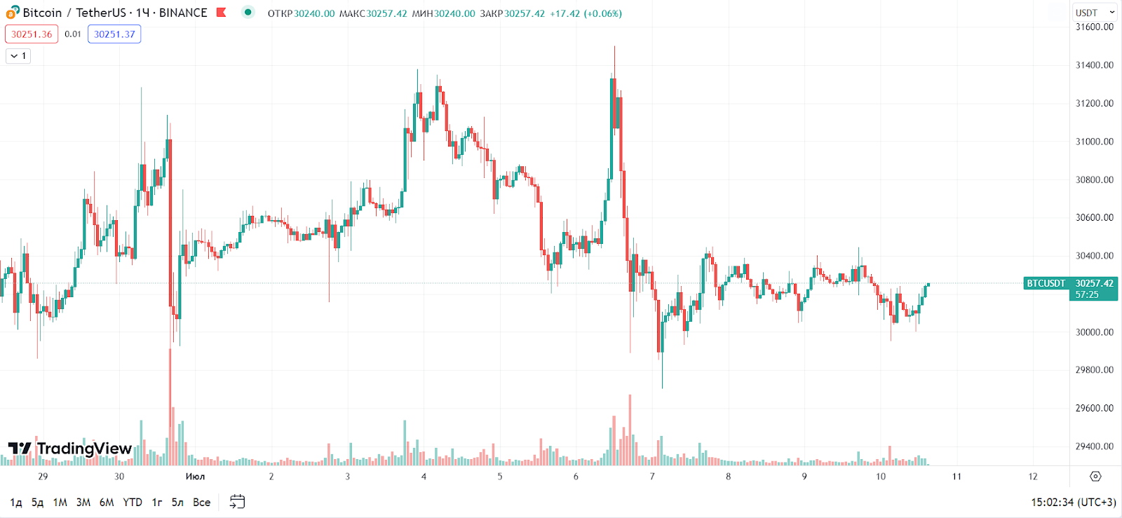 23 июня цена первой криптовалюты превысила $31 000, однако 6 июля котировки протестировали уровень поддержки $30 000.