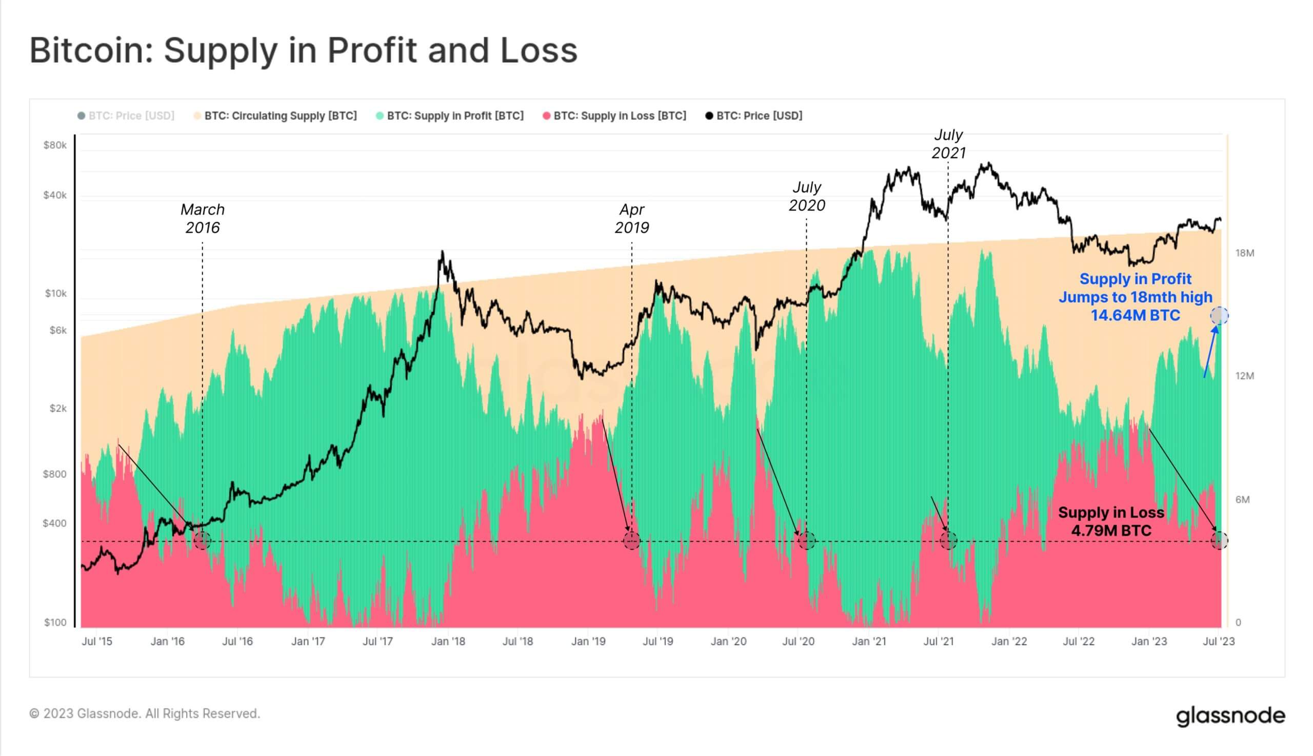 В целом по состоянию на эту неделю избавиться от собственных монет в плюс могут владельцы 14.64 миллиона $BTC — а это максимум показателя за последние полтора года.