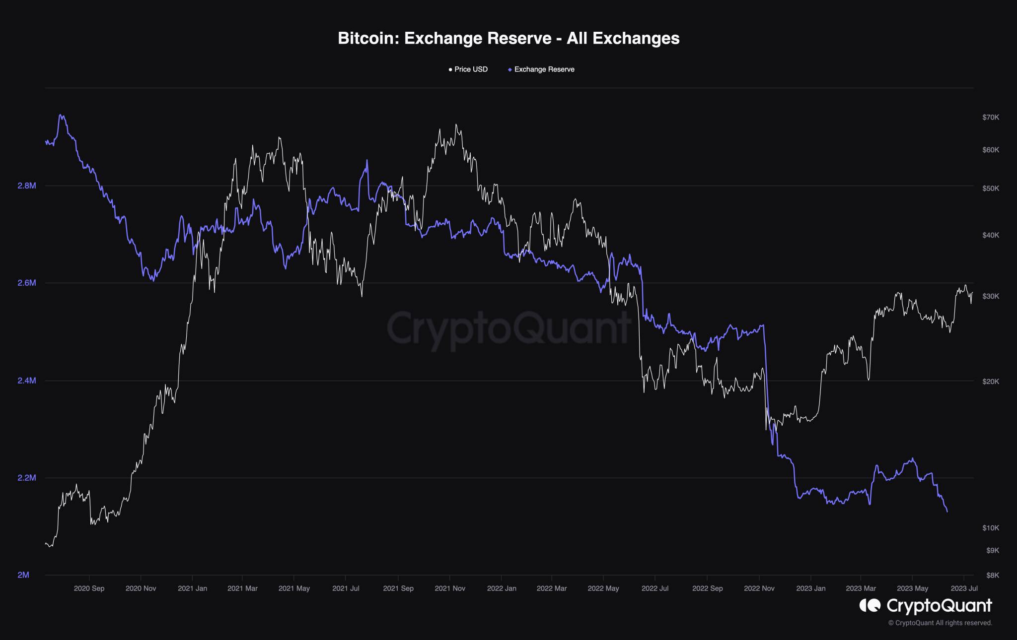 По данным cryptoquant.com, количество биткоинов, хранящихся в резервах криптобирж, неуклонно снижалось за последние два года и 11 месяцев.