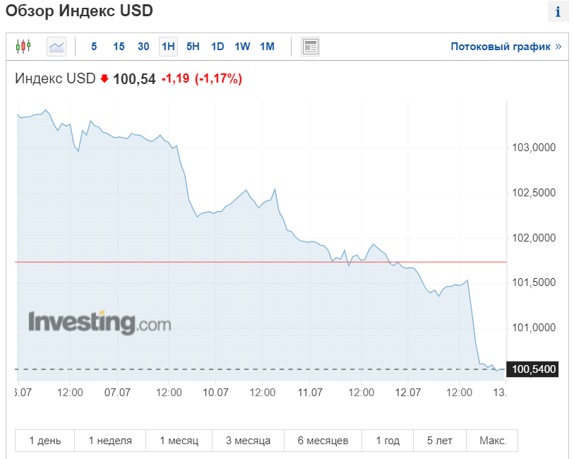 Тем временем индекс доллара США (DXY) достиг худших значений с мая, упав за четыре дня подряд на 2,15%. Ослабление доллара по отношению к корзине ведущих иностранных валют намекает на замедление аппетита инвесторов к активам-убежищам.