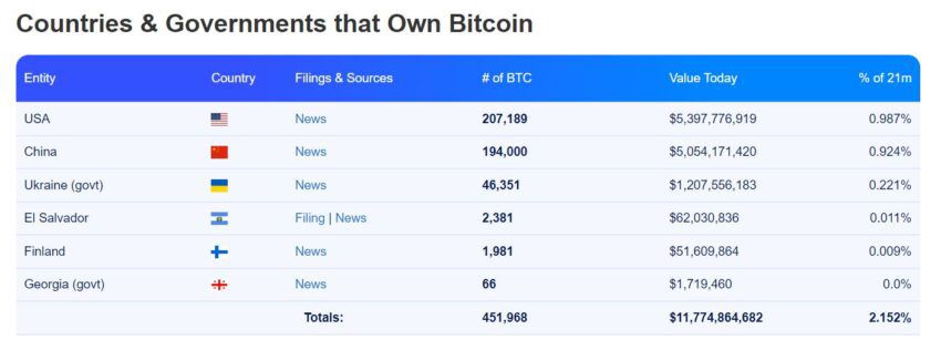 Также биткоины есть в распоряжении властей ряда стран. Например, у регуляторов США 207 189 BTC. Такой объем равен 0.98% от всей эмиссии криптовалюты. За Америкой идет Китай с 194 000 BTC — 0.9% от эмиссии биткоина.