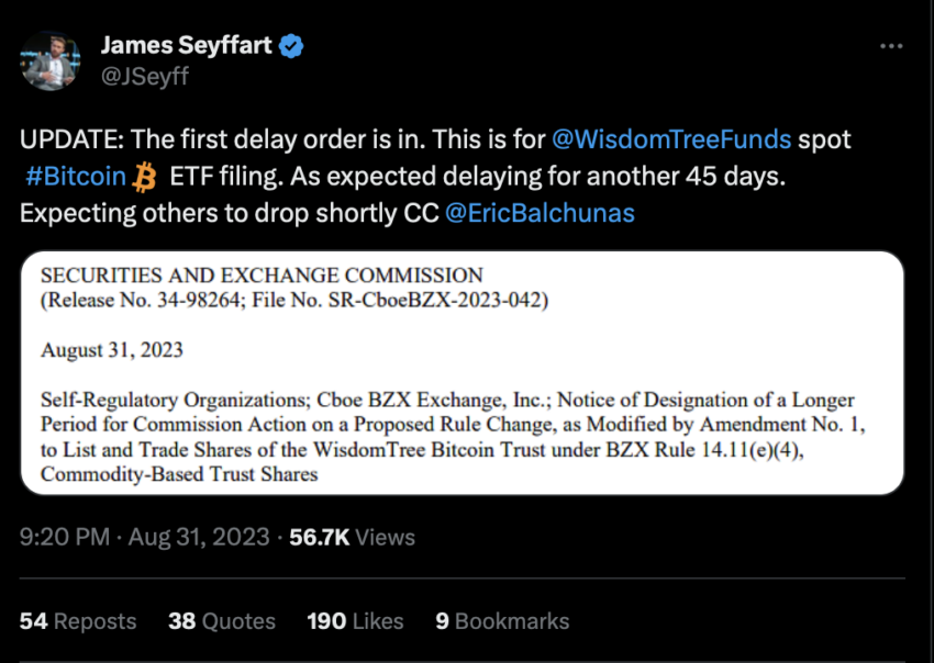 Комиссия по ценным бумагам и биржам США (SEC) заявила, что ей необходим «более длительный период» для оценки нескольких заявок на создание спотового биткоин-ETF, включая заявки Wisdom Tree Funds, Invesco и Galaxy Digital и Valkyrie Funds.