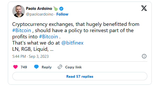 Что произошло? Технический директор Tether Паоло Ардоино считает, что криптовалютные биржи, которые «извлекли огромную выгоду из биткоина», должны проводить политику реинвестирования части прибыли в цифровой актив. Он подчеркнул, что торговая платформа Bitfinex, где Ардоино также является техдиректором, «именно так и поступает».