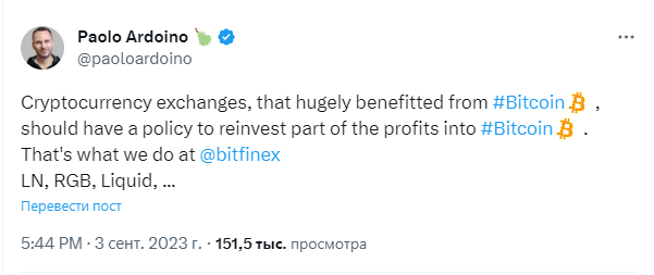 Это то, чем мы занимаемся в Bitfinex, — написал Ардоино, упомянув три протокола биткоина уровня 2: Lightning Network (LN), RGB и Liquid.