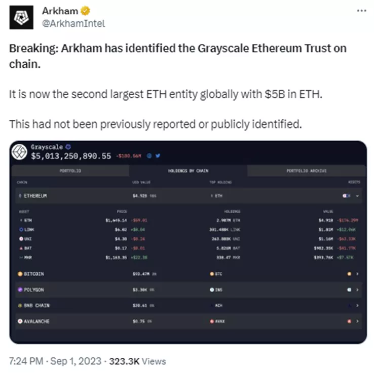 Эксперты аналитической платформы Arkham Intelligence связали свыше 1750 адресов с биткоин-трастом Grayscale Investments. Суммарно они содержат 627 779 BTC (~$16,15 млрд).