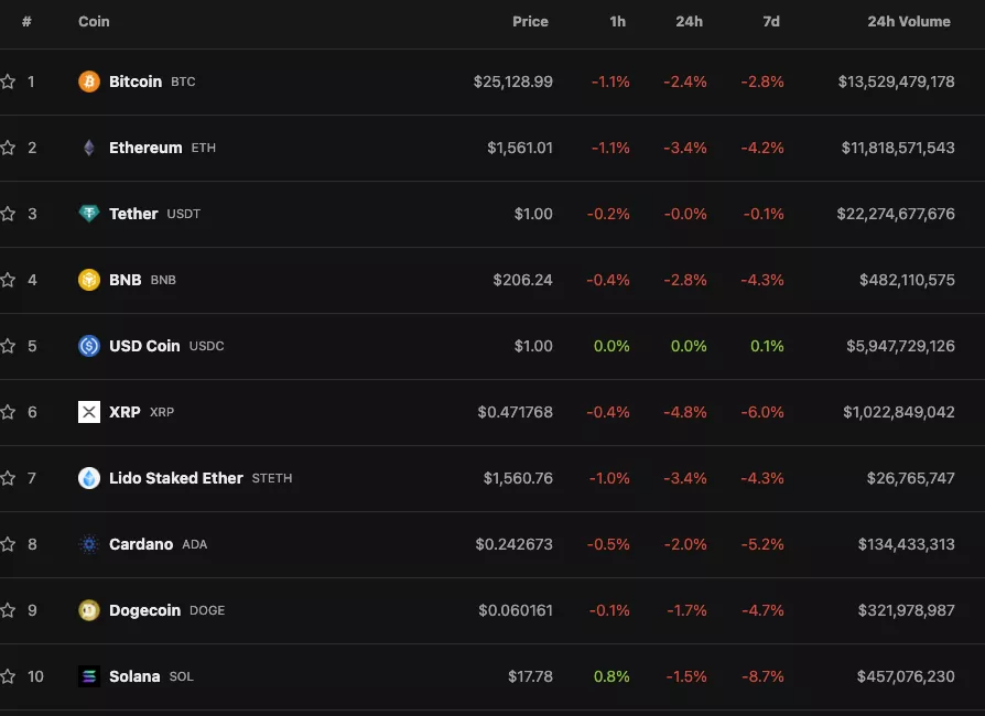 На момент написания цена держится выше уровня $25 100. Вслед за флагманом в «красную зону» перешли активы из топ-10 по капитализации. Самое заметное падение демонстрирует XRP — 4,8%.