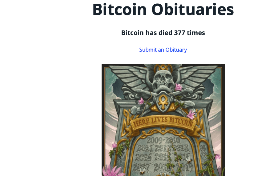 Всего Биткоин называли мёртвым 377 раз. Публикации с подобными заявлениями отслеживает специальный ресурс.
