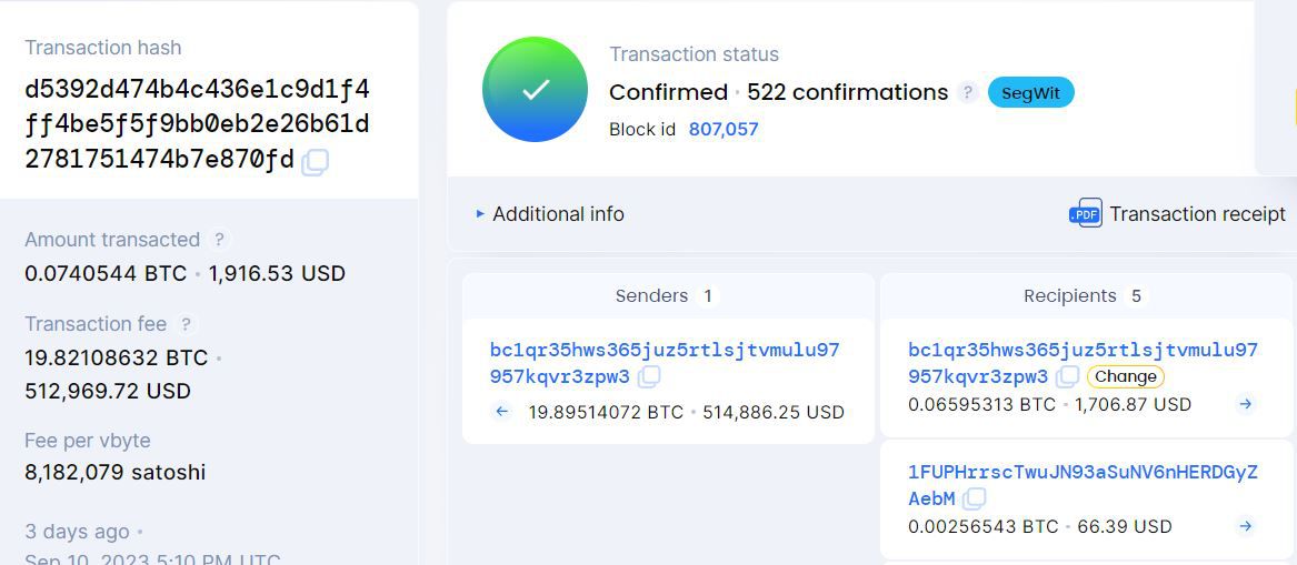 Стало известно имя пользователя, который случайно заплатил самую большую в истории рынка цифровых активов комиссию в размере 1 982 108 632 сатоши, или почти 20 BTC, стоимостью около 510 000 долларов, за перевод 0,074 биткоинов (около 1940 долларов)