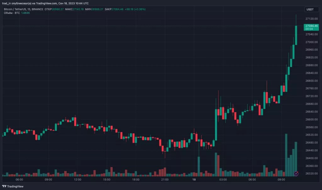 На момент написания биткоин держится на отметках вблизи $27 090. Как видно на графике ниже, рост сопровождается всплеском объемов торгов.
