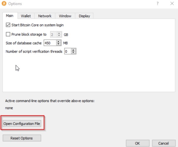 Откройте файл bitcoin.conf в приложении – выберите Settings →Options → Open Configuration File. (Альтернатива – переход в вашей файловой системе по пути C: \ Users \ [user] \ AppData \ Roaming \ Bitcoin).