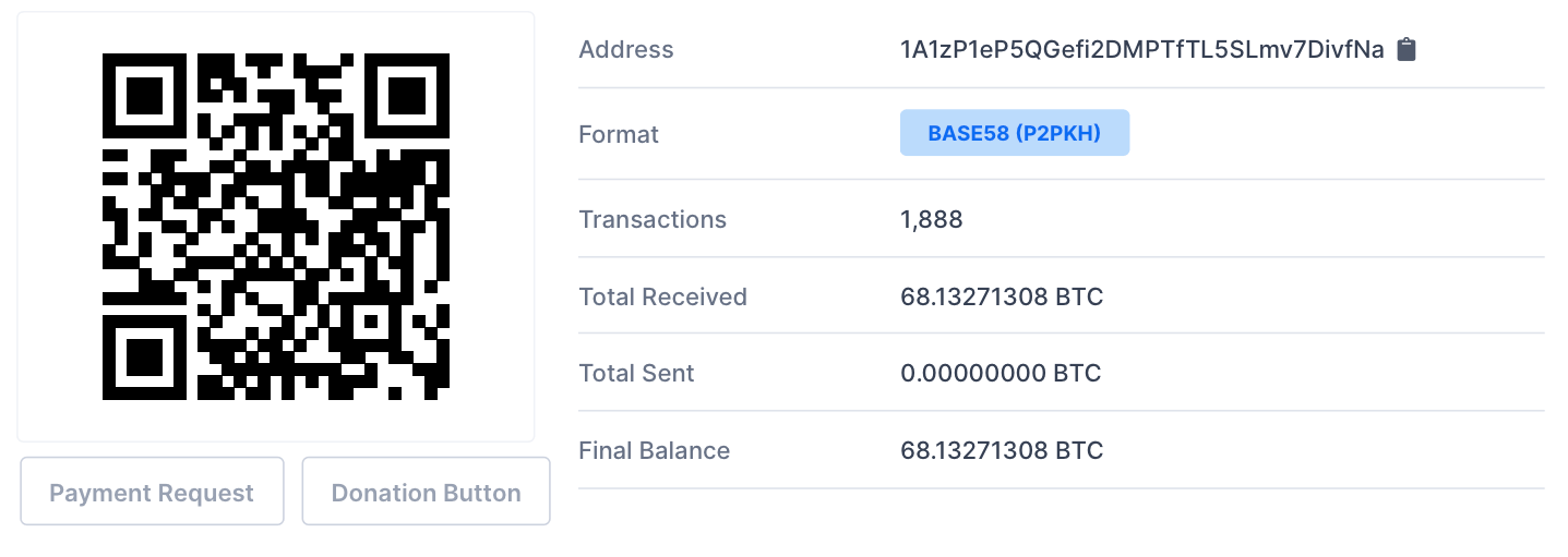 Самый популярный эксплорер для Биткоина — Blockchain.com. Вводим в верхней части экрана нужный адрес или хеш транзакции и получаем результат. Это могут быть детали операции или перечень транзакций кошелька. Вот, например, баланс рандомного кошелька 1A1zP1eP5QGefi2DMPTfTL5SLmv7DivfNa.