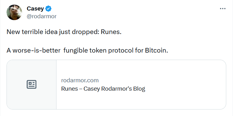 Кейси Родармор поделился идеей в «Твиттере». Он утверждает, что руны на основе UTXO станут «более простой» альтернативой сложным стандартам BRC-20.