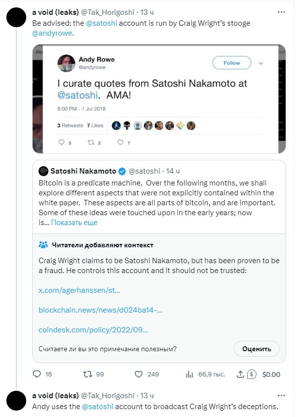 Один из пользователей соцсети написал, что учетной записью @satoshi управляет самозванец Крейг Райт @andyrowe, не заслуживающий ни малейшего доверия.