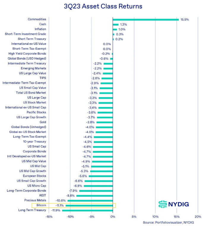 Компания NYDIG оценила динамику сорока самых популярных инвестиционных активов и выяснила, что в третьем квартале биткоин (BTC) потерял 11,1% стоимости и оказался в числе самых убыточных. Хуже дела обстоят только у долгосрочных гос.облигаций США (так называемых трежерес). Они подешевели на 11,9%. Замыкают тройку аутсайдеров драгоценные металлы с потерями 10,6%.