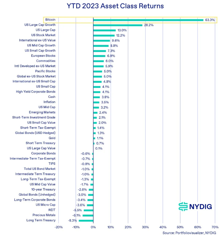 В разрезе текущего года BTC продолжает удерживать статус самого высокодоходного актива. С января монета продемонстрировала впечатляющий рост на 63,3%.