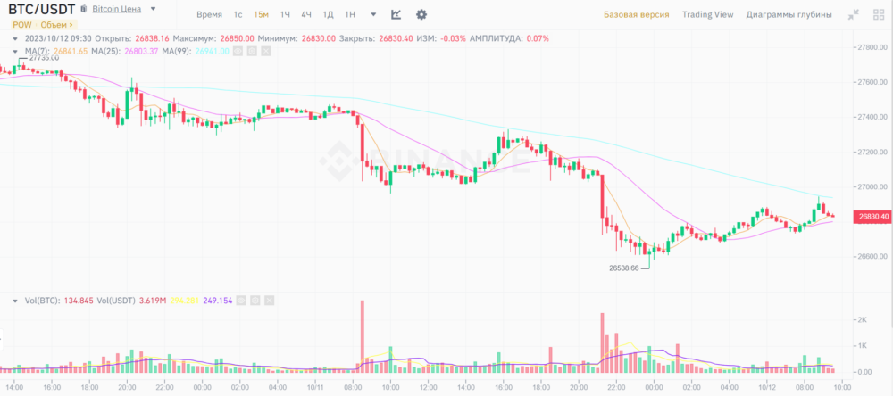 Цена Биткоина упала на 3 % за последние 24 часа и почти на 2% за неделю. $27127. 24-часовой минимум и максимум составили $26 800 и $27605 соответственно.