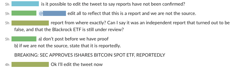 В 16:17 (Киев/МСК) команда Cointelegraph обнаружила информацию об одобрении биткоин-ETF. Некоторое время журналисты сверяли факты и не могли определиться с их подлинностью. Однако один из сотрудников «поспешил» и опубликовал пост в X.