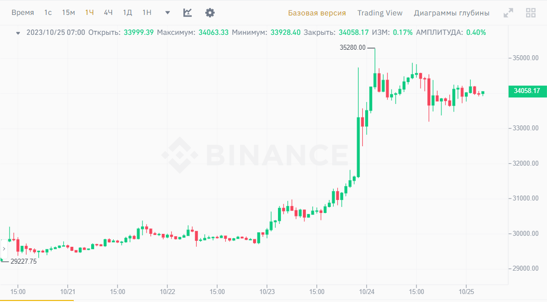 На 24-часовом таймфрейме Биткоин вырос до уровня 34 267$ и теперь все будет зависеть от преодоления или непреодоления этой отметки.