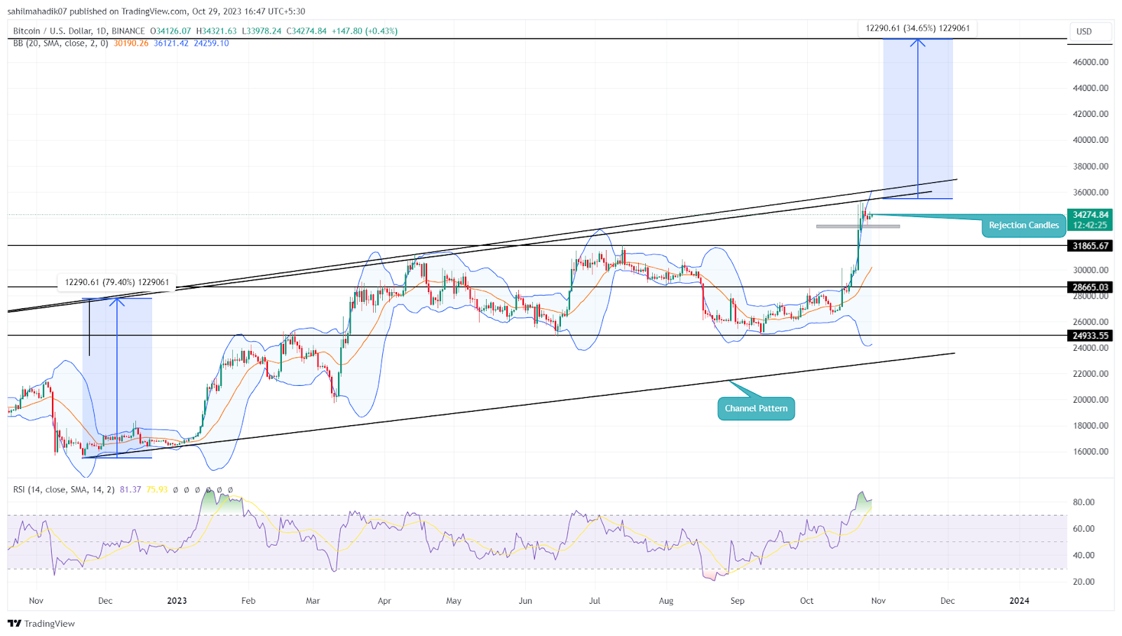 За последние семь дней цена Биткоина выросла на 14,44%, установившись на отметке около 34 253 долларов США после достижения нового годового максимума в 35 157 долларов США, но не сумев преодолеть этот ценовой уровень.