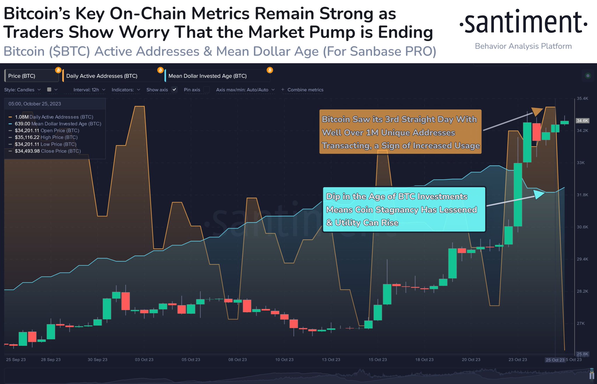 Октябрьский забег BTC сопровождался высокой сетевой активностью. Количество адресов, ежедневно отправляющих и получающих средства, увеличилось до 1,08 млн.