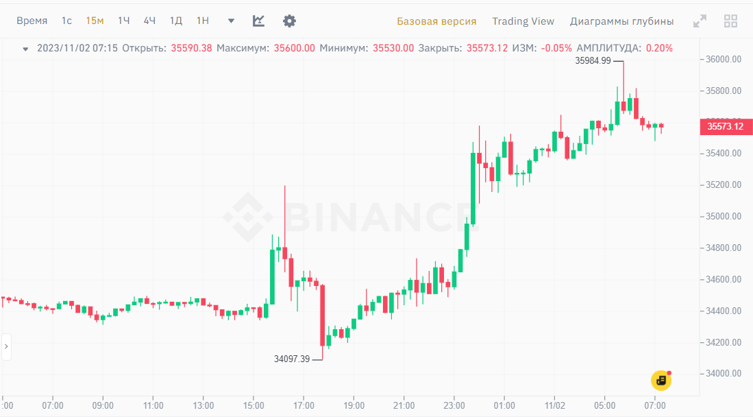 Цена Биткоина вчера в моменте снова преодолела отметку в 35 000 долларов перед заседанием ФРС, а позже поднялась почти к уровню 36 000 долларов за единицу. Федеральная резервная система (ФРС) США оставила ставку на уровне 5,25-5,5%.