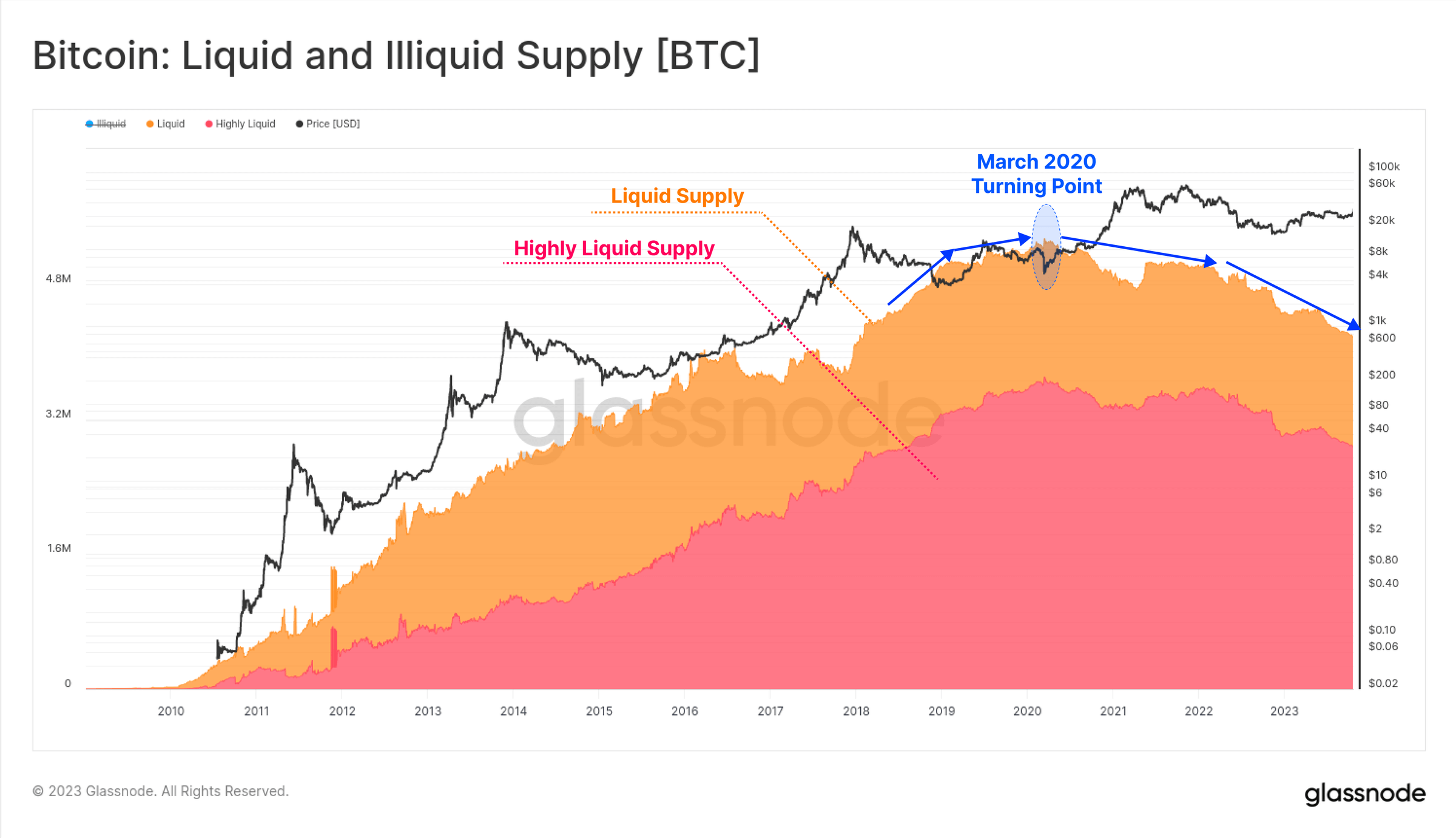 В частности, объём ликвидного предложения биткоинов сократился до исторического минимума. Речь идёт о монетах на адресах, владельцы которых преимущественно накапливают цифровые активы, а не тратят их.