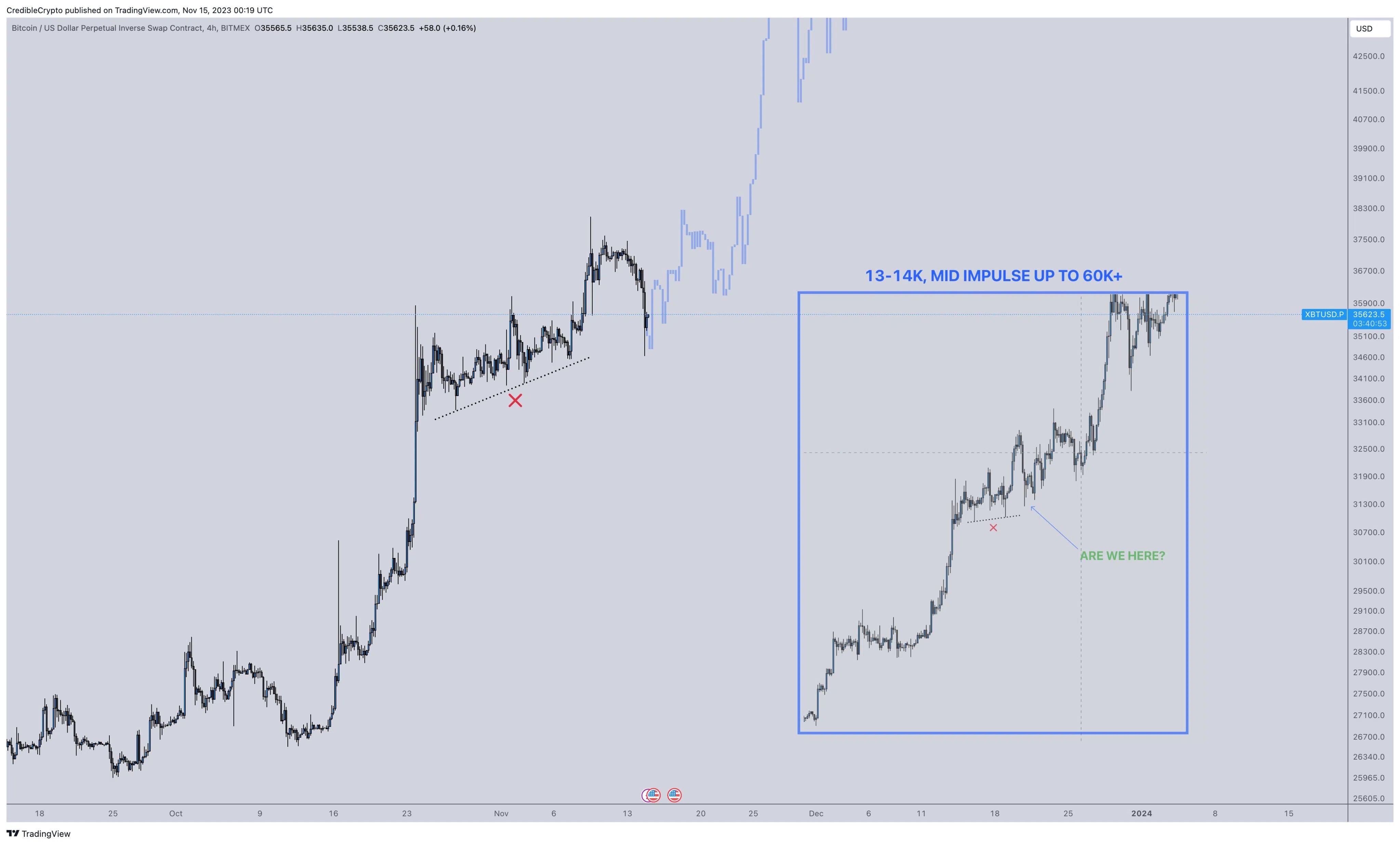 Некоторые участники криптосообщества предполагают, что BTC уже прошел коррекцию и направляется к обновлению локальных максимумов. Например, популярный в криптосообществе аналитик CrediBULL Crypto считает, что монета стоит на пороге очередной волны роста. Предполагаемую траекторию движения BTC он представил на графике.