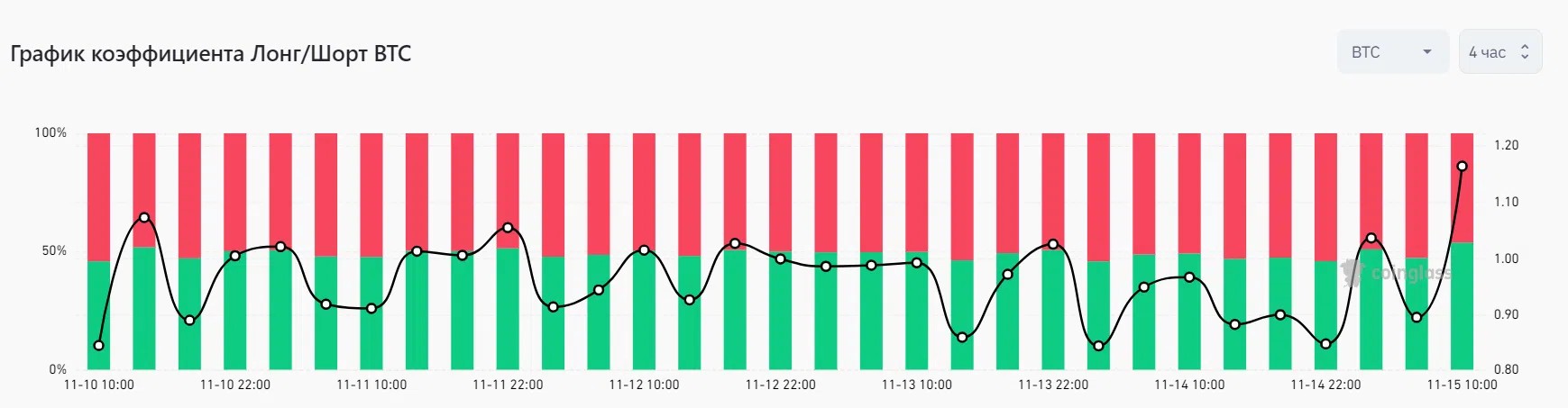 Соотношение длинных биткоин-позиций к коротким. Источник: Coinglass