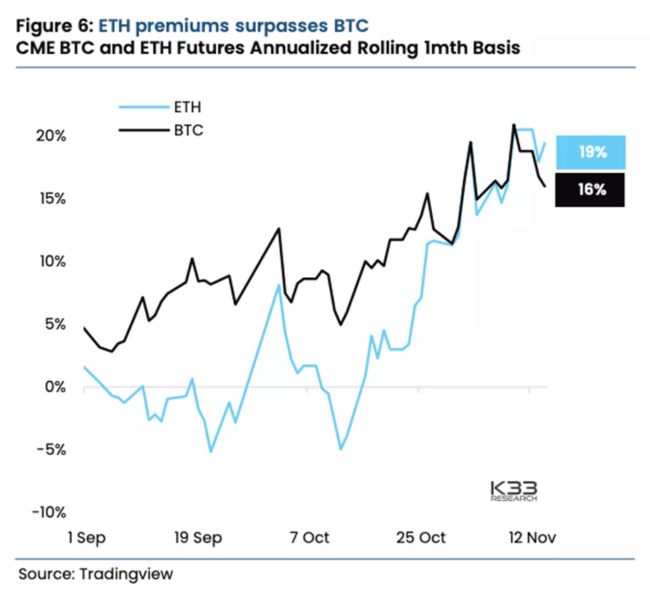 Аналитики отдельно выделили ситуацию на CME, где годовые премии по фьючерсам на биткоин и Ethereum в течение последних трех недель удерживаются выше 15%.
