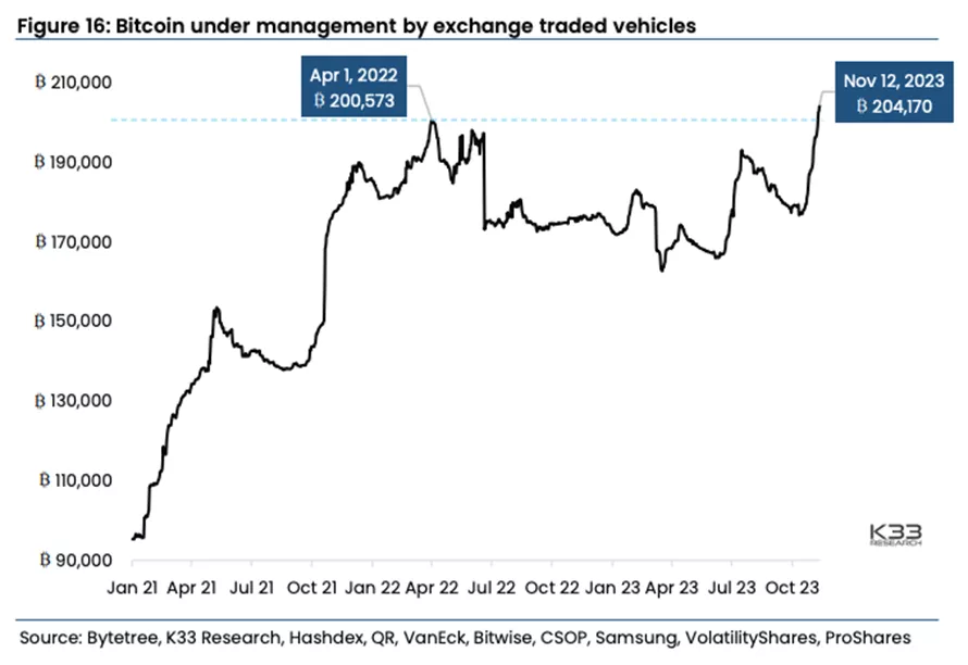 Объем активов в биткоин-продуктах достиг рекордных 204 170 BTC. Аналитики K33 Research объяснили ситуацию приближением сроков принятия SEC решения по заявкам на запуск спотового ETF на базе цифрового золота.