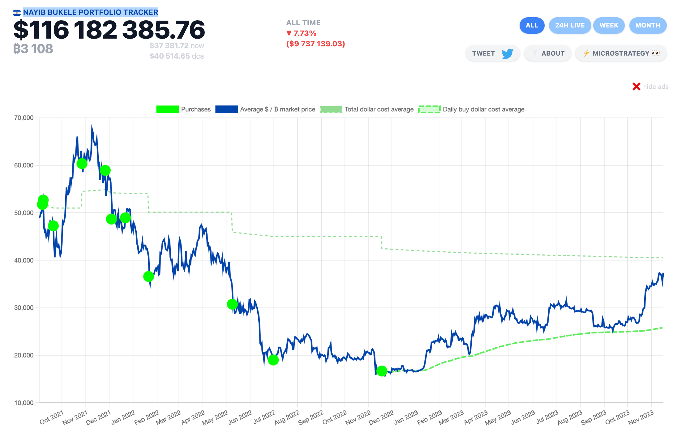 Сделки по покупке BTC до сегодняшнего дня принесли стране разве что незафиксированный убыток. Поэтому Букеле и другие члены правительства не распространяются о точном количестве приобретённых биткоинов. Впрочем, по подсчётам платформы Nayib Bukele Portfolio Tracker, страна могла купить 3108 BTC общей стоимостью более 116 миллионов долларов по текущему курсу криптовалюты, сообщает Coindesk.