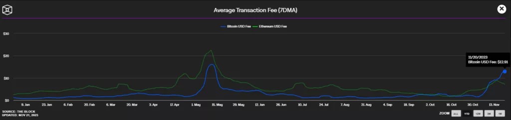 «Хотя в обеих сетях в последнее время наблюдается всплеск активности (и, как результат, комиссий), недавнее возрождение выпуска и трейдинга Ordinals, похоже, подтолкнуло к тому, чтобы средняя комиссия стала выше, чем у Ethereum», — отметила исследовательница The Block Ребекка Стивенс.