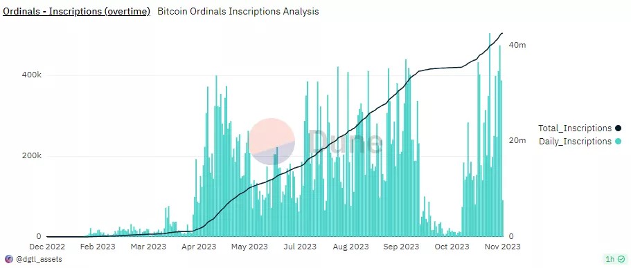 На графике ниже виден ноябрьский всплеск суточного объема выпуска Ordinals после глубокого спада в сентябре-октябре.