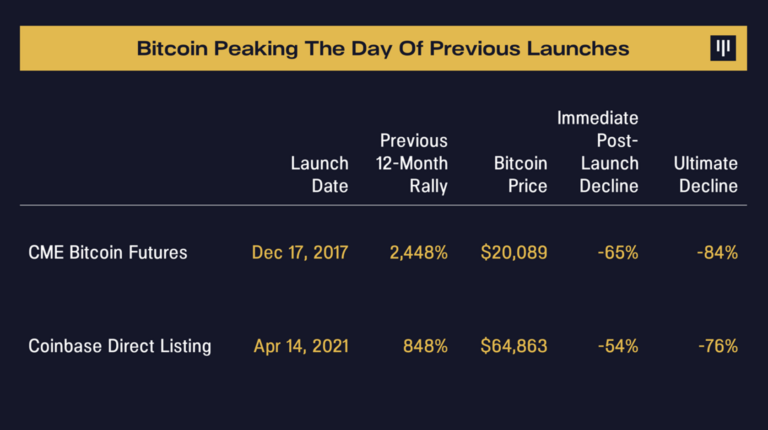 День запуска фьючерсов CME на биткоин в декабре 2017 года ознаменовал пик бычьего рынка на уровне $20 000 долл. К началу февраля цена актива рухнула на 65%. В день проведения IPO Coinbase в апреле 2021 года цена BTC составляла около $65 000, но к июлю того же года она упала на 54%.