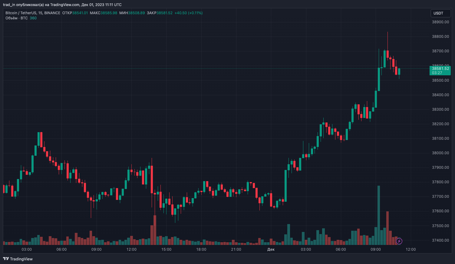 На момент написания биткоин держится над уровнем $38 500. Рост котировок сопровождался увеличением объема торгов.