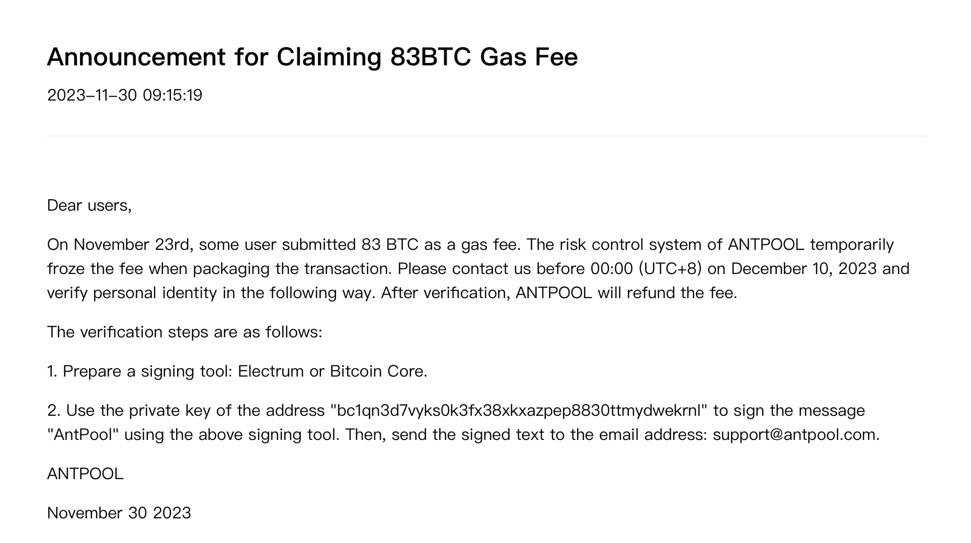 Спустя неделю после добычи блока с транзакцией представители Antpool опубликовали сообщение в блоге компании и установили дедлайн до 10 декабря 2023 года.