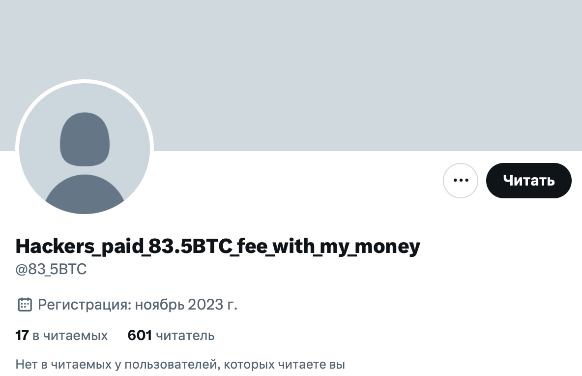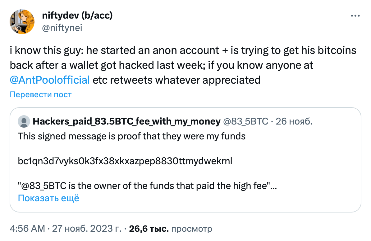 24 ноября 2023 года — спустя всего день после совершения своего перевода — автор транзакции рассказал о проблеме в Твиттере. Сделал он это в анонимной учётной записи с подписью @83_5BTC, а значит она наверняка создавалась исключительно для этой публикации. Вот перевод соответствующего сообщения.