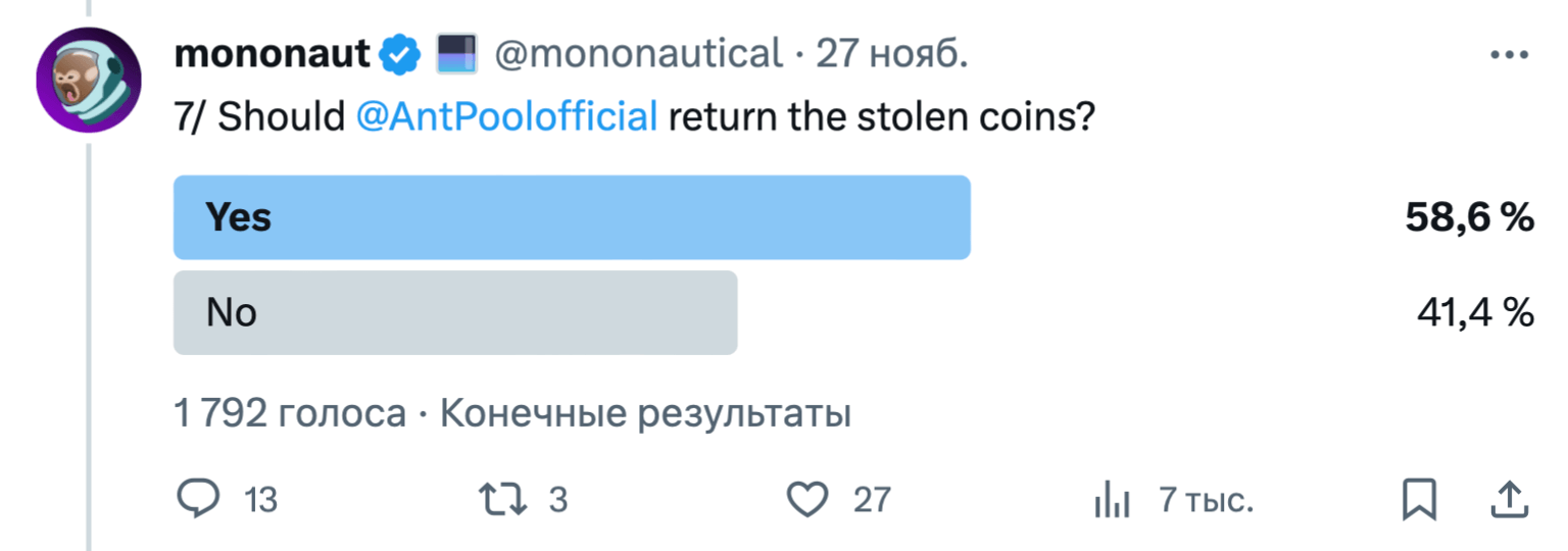 Будет лучше всего, если Antpool найдёт другой способ подтверждения личности жертвы. Однако она по очевидным причинам не хочет раскрывать свои личные данные перед всеми. В итоге участники голосования на странице Mononaut в Твиттере разделились во мнении: из 1792 человек 58.6 процента респондентов уверено, что Antpool должен вернуть средства уже сейчас, тогда как остальные 41.4 процента не поддерживают этот вариант.