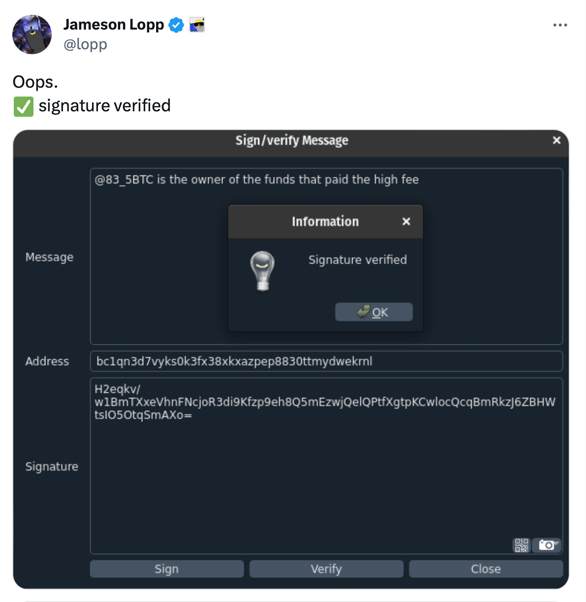 Подлинность подписи проверил разработчик под псевдонимом Mononaut, который занимается вопросами мемпула, то есть очереди неподтверждённых транзакций в сети Биткоина. Вот соответствующий скриншот.
