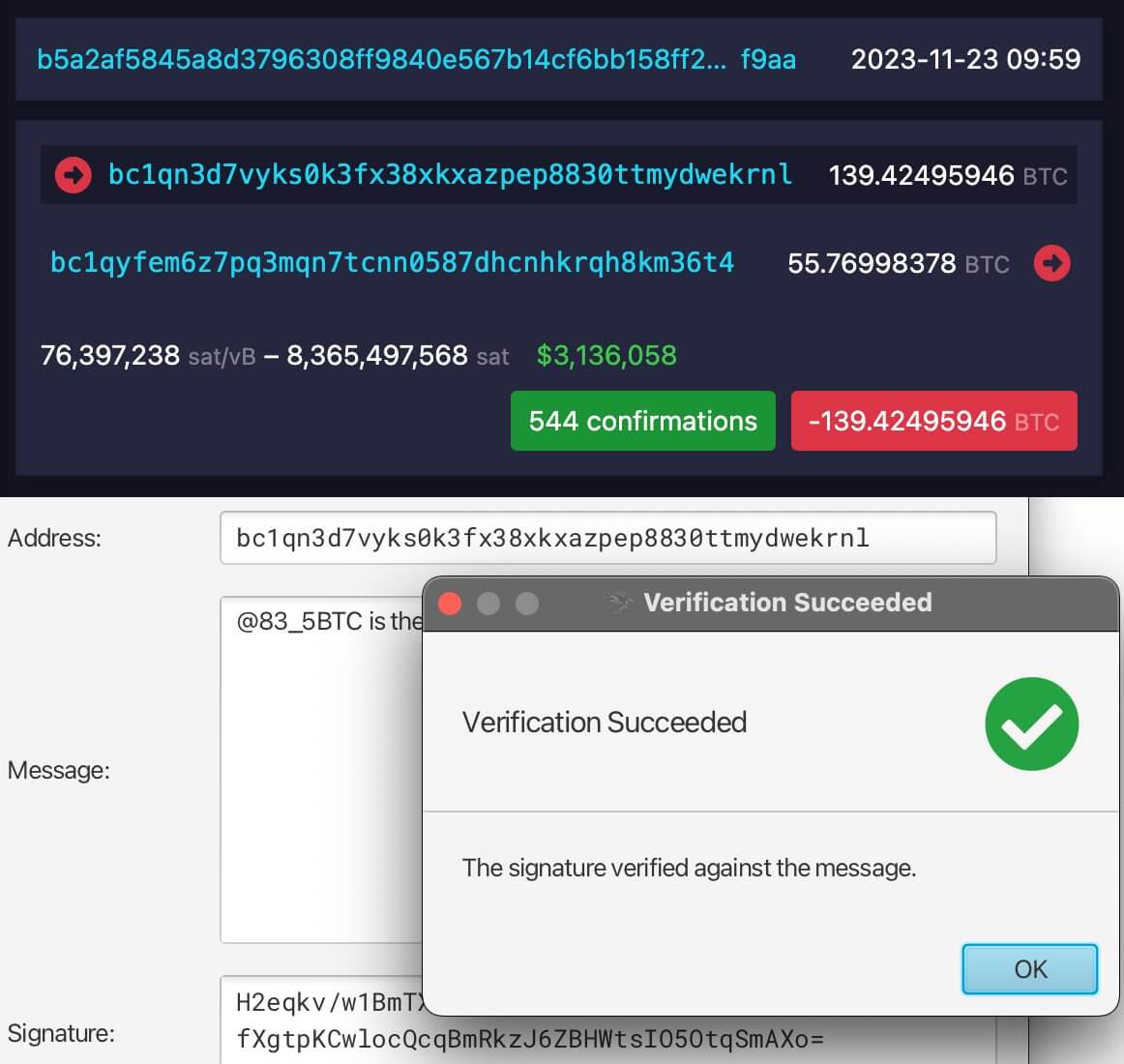 То есть пользователь заявил о том, что стал жертвой хакеров, которые провели необычный перевод. Для подтверждения соответствующей реплики автор учётной записи 83_5BTC подписал сообщение с адреса, совершившего перевод.