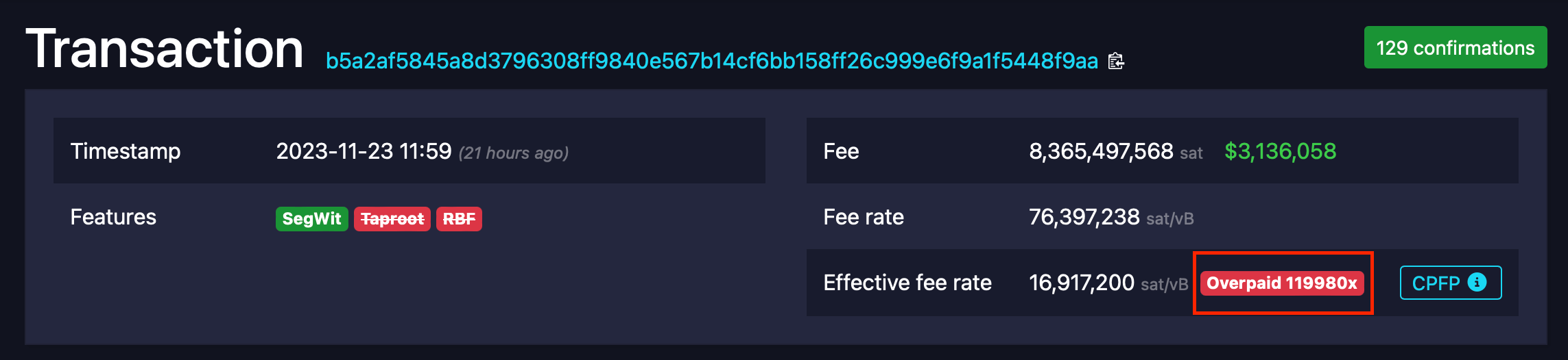 Это за мои биткоины была заплачена настолько высокая комиссия. Я создал новый холодный кошелёк, перевёл на него 139 BTC, и они сразу же были переведены на другой кошелек. Я могу только представить, что кто-то запустил скрипт на этом кошельке, который отличается странным расчётом комиссии.