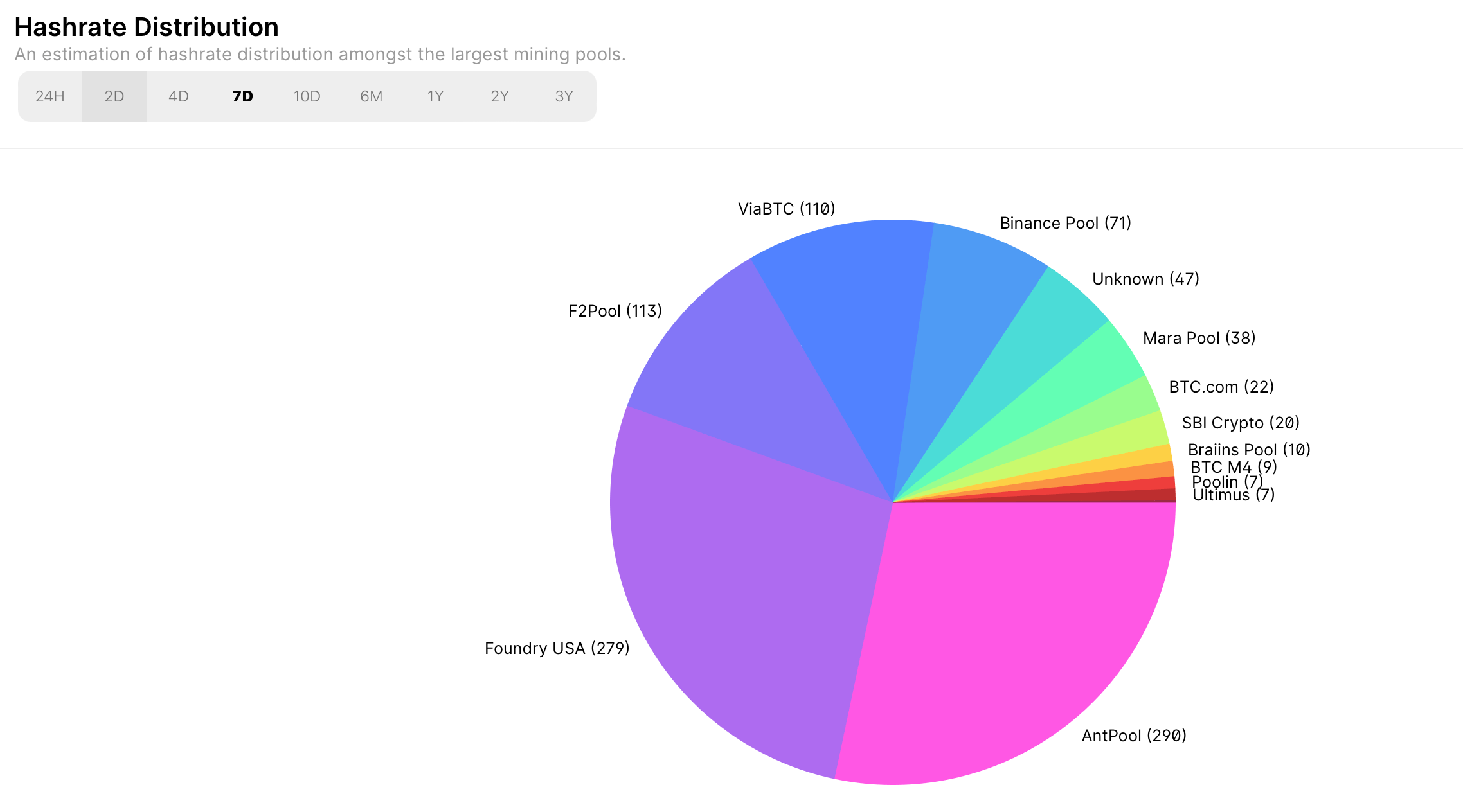 Распределение хешрейта в сети Биткоина между майнинг-пулами за последнюю неделю