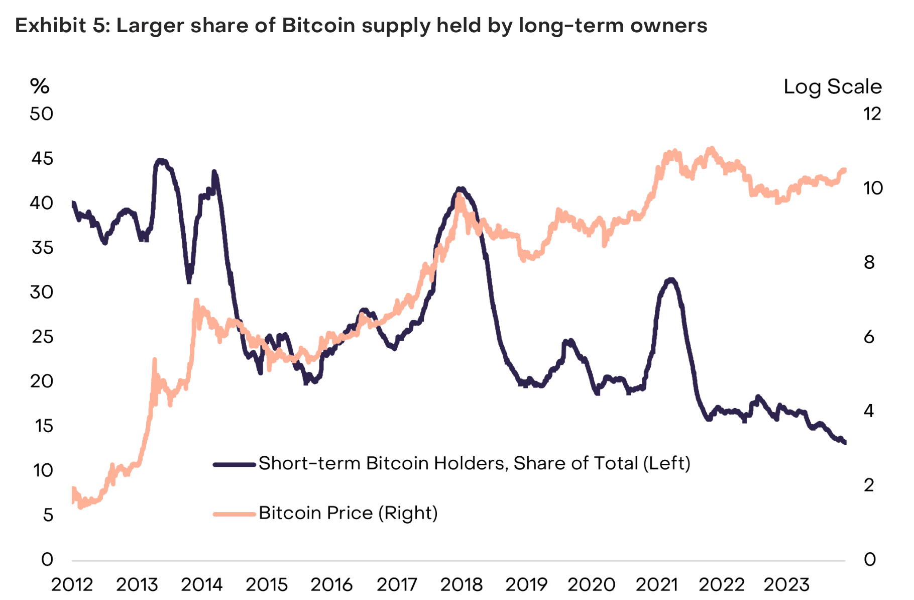 Падение доли краткосрочных держателей Биткоина с каждым годом