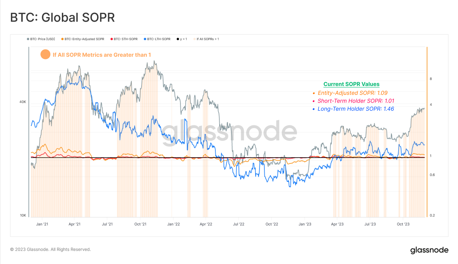 Рост индекса SOPR на прошлой неделе указывал на большую прибыль, извлекаемую продавцами, выяснила компания Glassnode.