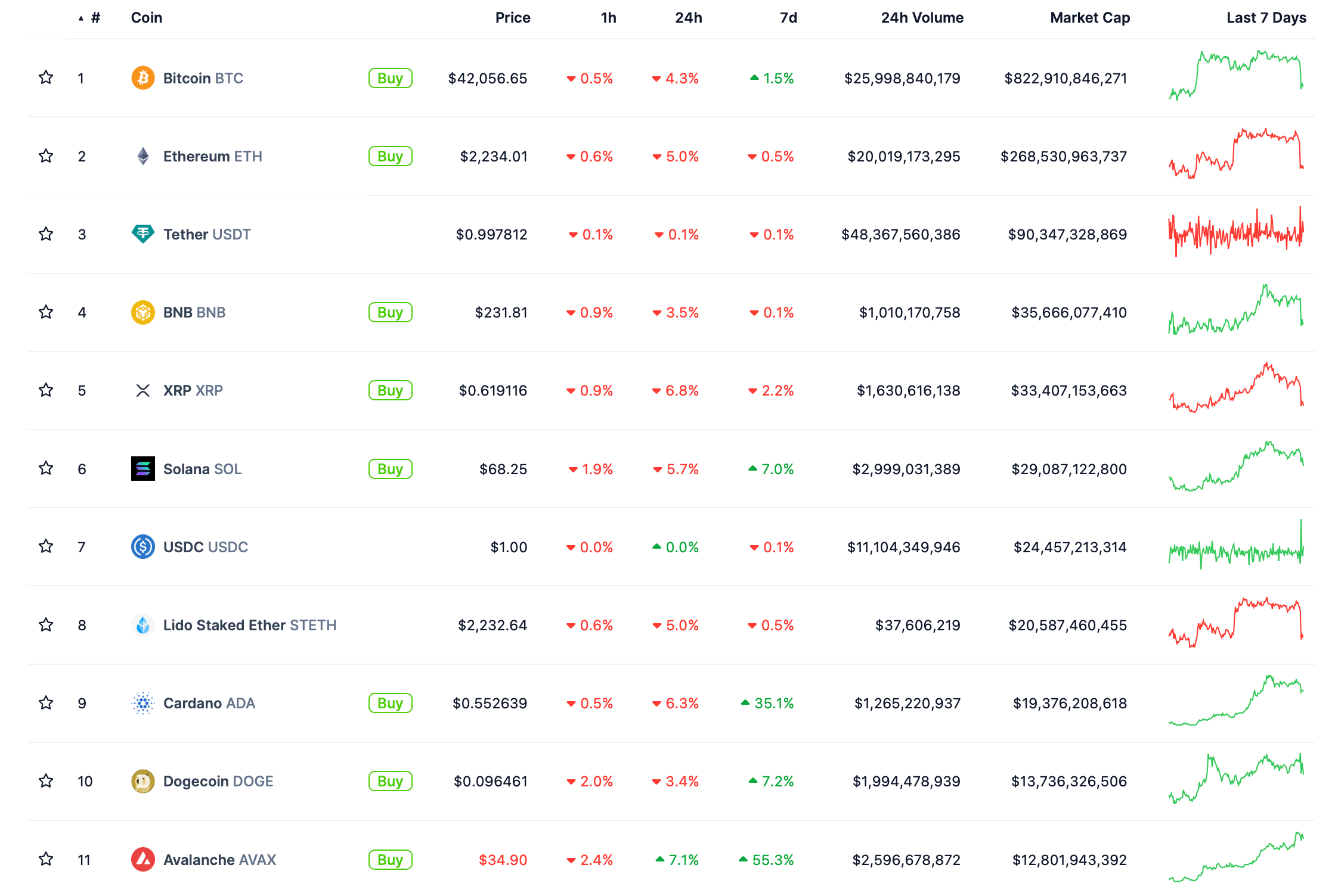 Биткоин начинает новую неделю с просадки до уровня 42 тысяч долларов.