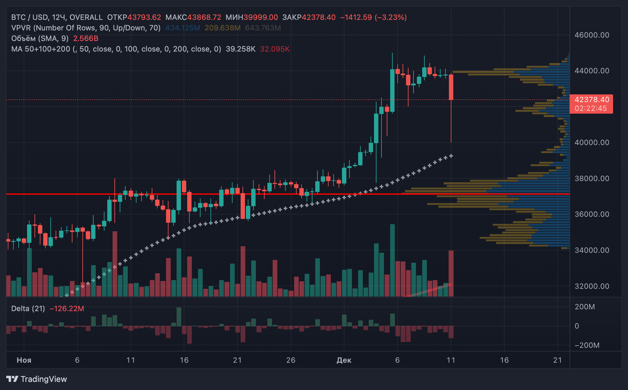 По данным скринера криптовалют Cryptovizor, определяющего цену BTC/USD по результатам торгов на спотовых биржах, курс актива снизился до $39 999. После этого произошел отскок, на момент написания статьи цена соответствовала $42 378.