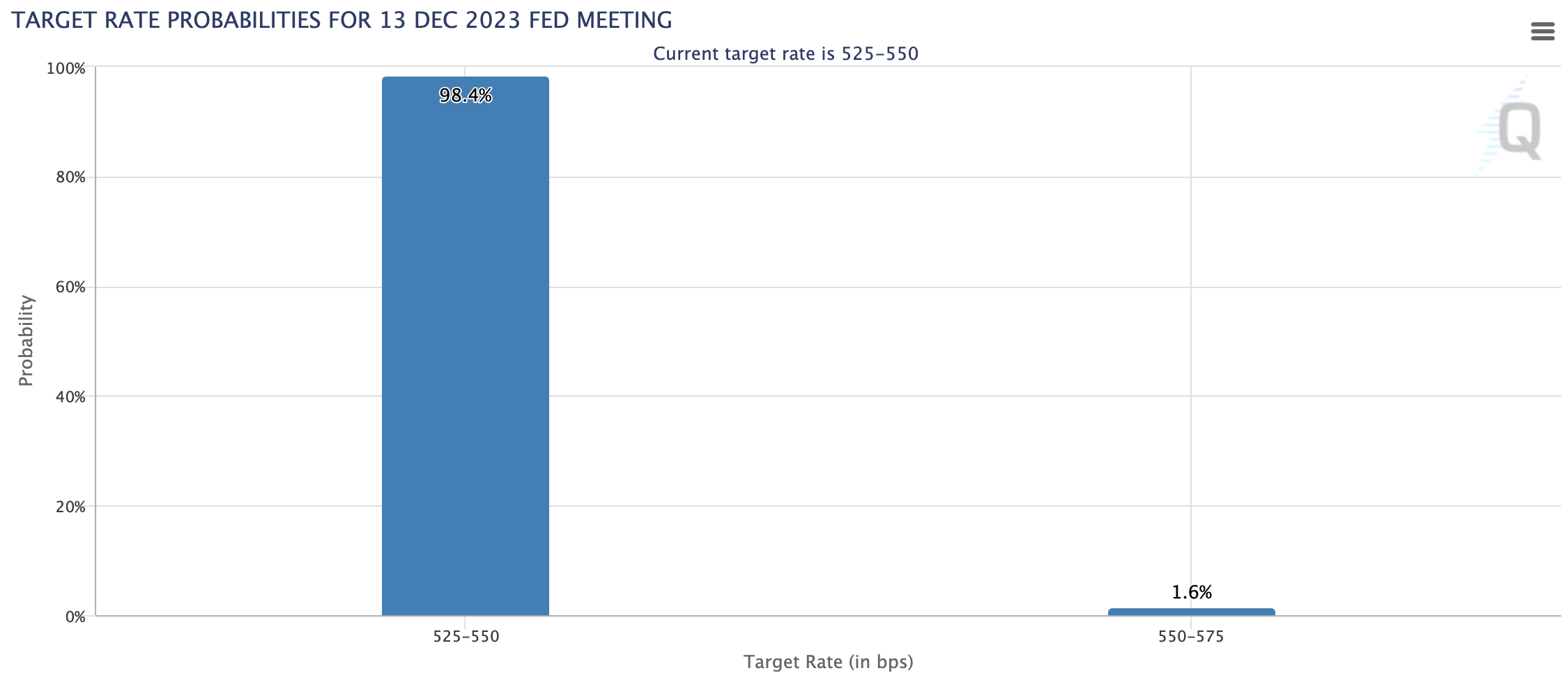 Однако эти данные не смогут повлиять на решение ФРС, поскольку картина уже ясна: с вероятностью 98,4% ставка сохранится на текущем уровне, а переход к ее снижению произойдет в середине 2024 года.