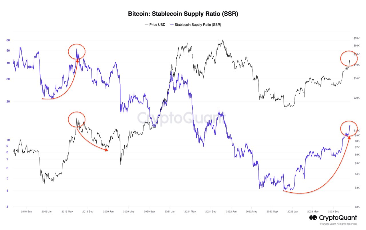 Минкью отметил, что SSR значительно увеличился с января по декабрь 2023 года. По его мнению, это указывает на то, что инвесторы отдают предпочтение конвертации биткоина в стейблкоины, ожидая коррекции цены.