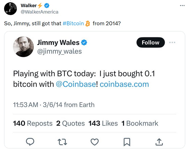 При этом один из пользователей под ником @WalkerAmerica напомнил Уэйлсу, как в 2014 году тот хвастался покупкой 0,1 BTC через Coinbase.